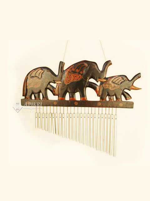 Wind Chimes, Elephant shape batiked, alumunium and Sengon (Albizzia falcatae) wood, brown color, aqua lacquer coating.