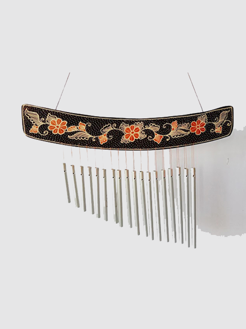 Wind Chimes, Sengon wood combine with pipe for sound, flower motif batik, black and orange color, aqua lacquer coating.