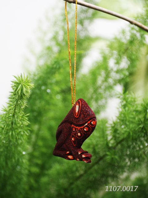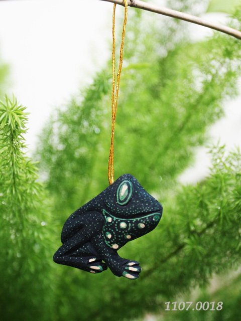 Christmas accessories, silent frog shape, Sengon wood, Dot motif batiked, black-blue color, gold string, w/o coating.