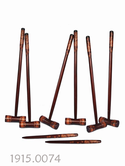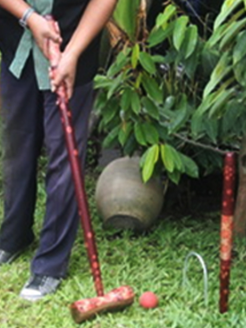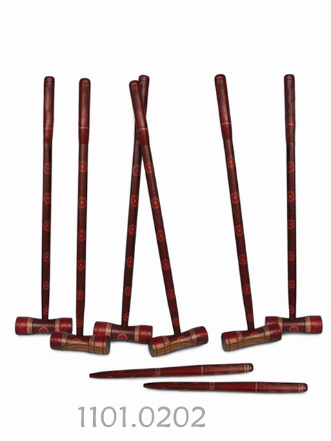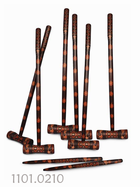 Croquet set, consists of: 6 pcs mallets, 2 pcs stakes, 1 pcs rubber ball, 1 pcs metal wicket. Mallet and stake from wadang and black wood, ceplok suko and mlati motive batiked, red and dark red color, aqua laquer coating.