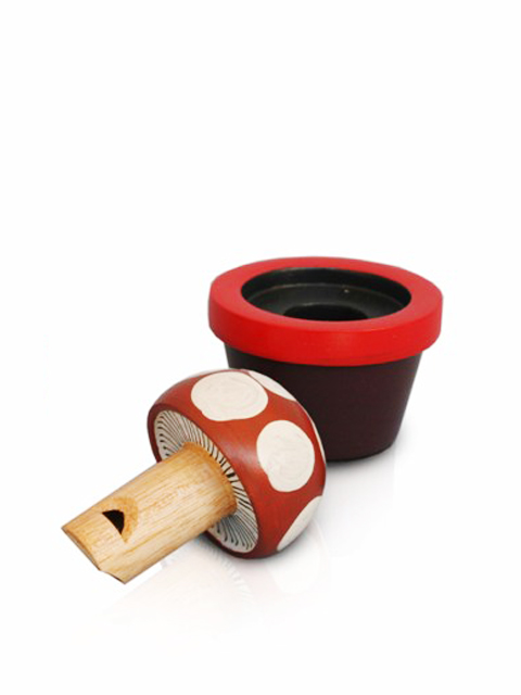 Whistle, mushroom in a pot, painted, dot motif,brown, white and red color, aqua lacquer coating.