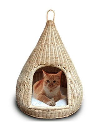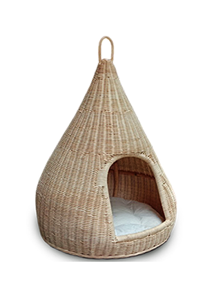 Handmade Apikri Cat house with mattress inside, cone shape, rattan material, natural color, aqua lacquer coating.